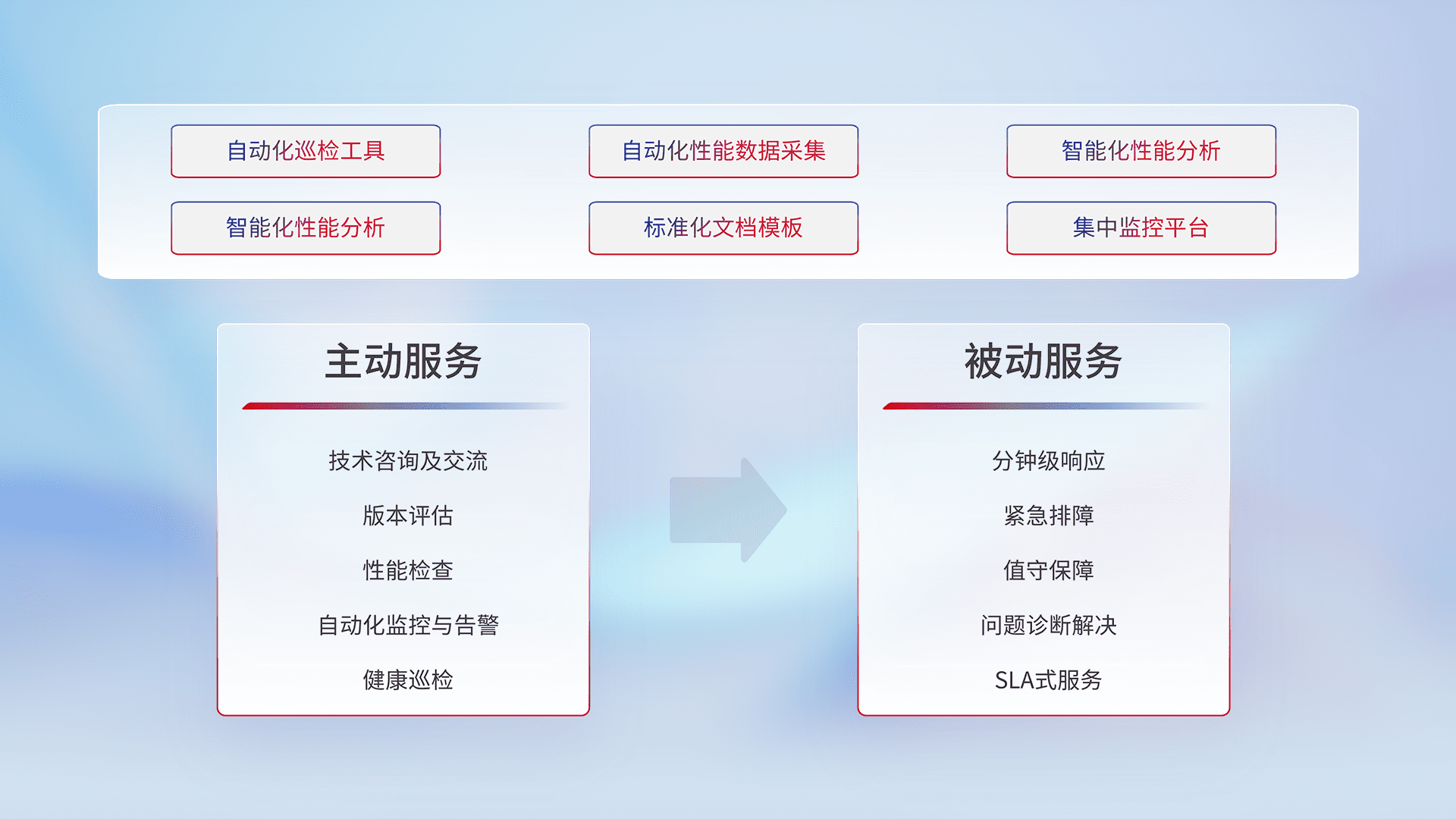 智能化工具和标准化文档,,保障服务质量,,,,提供主动服务(包含技术咨询、、版本评估、、、性能检查、、自动化监控与告警、、健康巡检)和被动服务包含(分钟级响应、、紧急排障、、、值守保障、、、、问题诊断解决、、、SLA服务)。。。